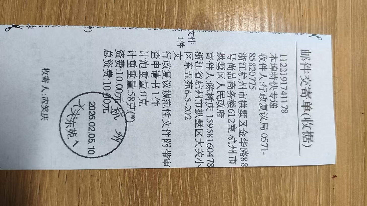 2026年1月25日,申请人陈树庆向杭州市拱墅区人民政府邮寄递交了《行政复议申请书》,请求被申请人杭州市拱墅区社会保险管理服务中心履行法定社会保险责任,按照申请人的《浙江省职工基本养老保险历年参保证明》所表明的累计缴费24年4个月的年限,为申请人办好退休资格确认、核定退休金额并发放退休金。2026年2月3日经拱墅区行政复议局同意,申请人将本行政复议的被申请人变更为杭州市拱墅区人力资源和社会保障局。2026年2月4日,申请人陈树庆收到《行政复议受理通知书》杭拱政复[2026]67号。