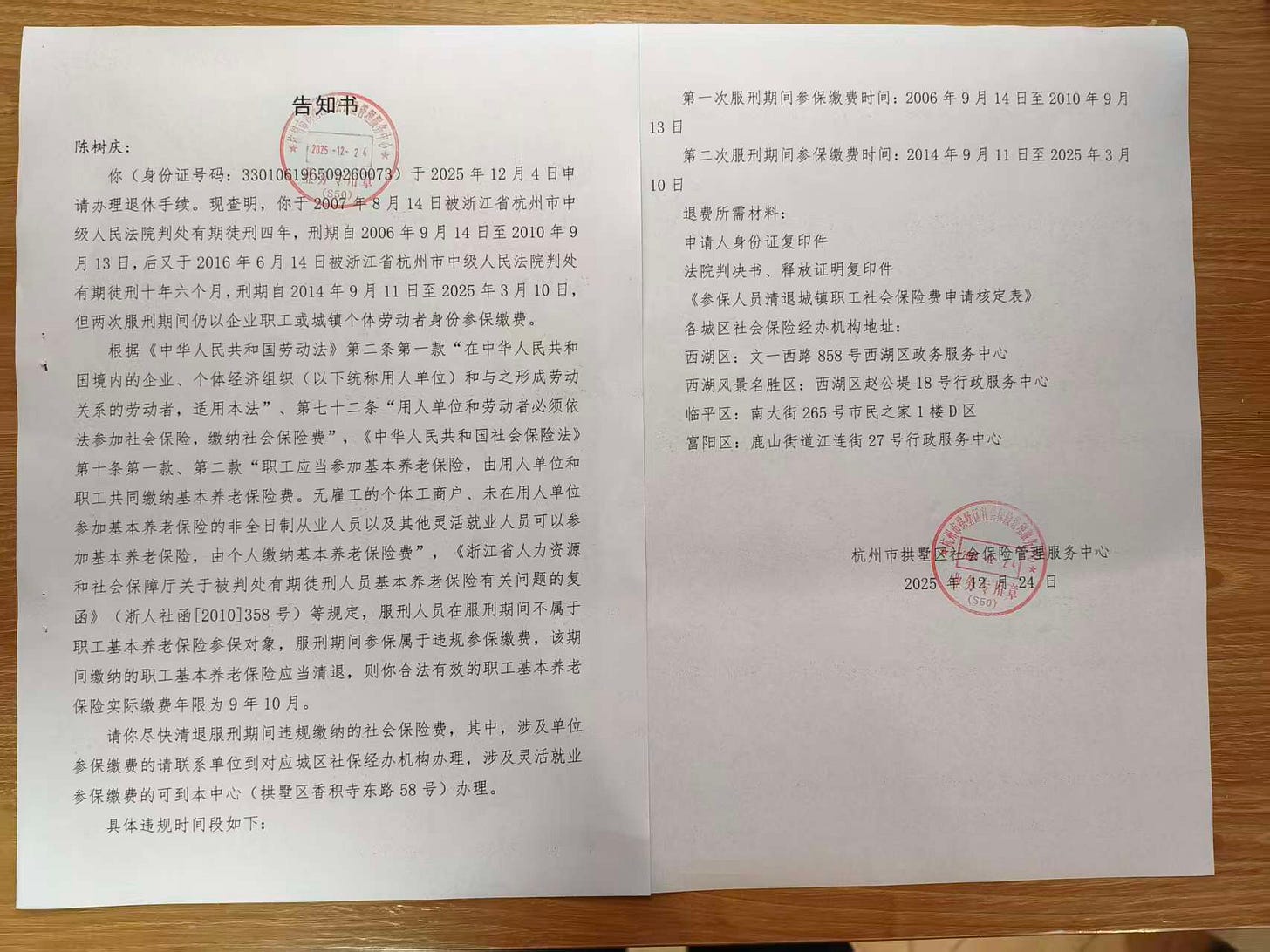 2025年12月25日上午9点刚过,我接到0571-87882793电话,电话那头是12月17日我在香积寺路58号拱墅区政务服务中心办理退休手续时,接待我的105室工作人员陈明朋,说他才知道我在12月4日已经向大关街道提交了办理退休的申请,而且他现在也已收到了我向杭州市拱墅区人力资源和社会保障局提出《政府信息公开申请书》,说我所要的材料已经准备好,他让我过去拿。我答应马上过去,在上午10点不到就赶到了他那里,拿了几份材料,其中有一份盖着“杭州市拱墅区社会保险管理服务中心”印章的《告知书》,一份制作日期是二〇一〇年九月三十日的《浙江省人力资源和社会保障厅文件-浙人社函[2010]358号-关于被判处有期徒刑人员基本养老保险有关问题的复函(此件依申请公开)》等。