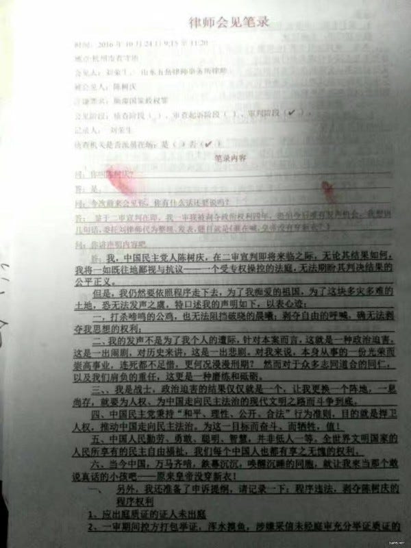 我,中国民主党人陈树庆,在二审宣判即将来临之际,无论其结果如何,我将一如既往地鄙视与抗议——一个受专权操控的法庭,无法期盼其判决结果的公平正义。