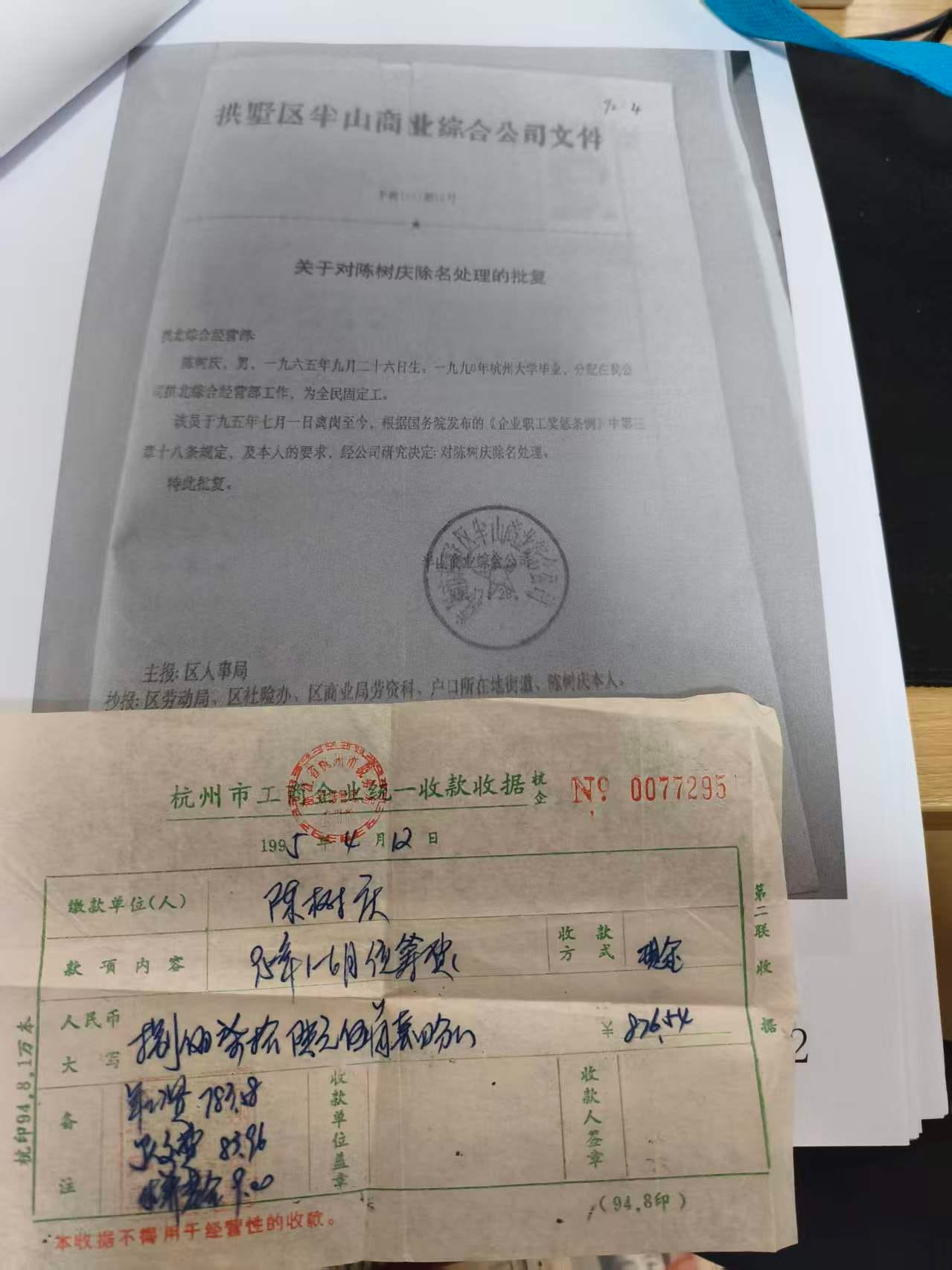 1995年7月拱墅区半山商业综合公司《关于对陈树庆除名处理的批复》,里面所描述“该员于95年7月1日离岗至今”是虚构的、不符合我与该公司约定。 实际情况是单位本身经营长期不善(老国有商业单位受大量专业市场、综合市场个体商贩的冲击),早在一年多以前已停发工资,随后我提出承包业务,但因没有提供我为单位创收所需要的条件(看中的营业场地被别人租走),只好约定允许申请人陈树庆自谋生计,人事关系继续挂靠在单位并代为缴纳社保,当然实际费用都由陈树庆自己提供(见申请人前些天家中翻箱倒柜才找出的,在本《申述》的附件:陈树庆向单位支付的代缴社保费用《杭州市工商企业统一收款收据》0077295号为证),这种情况下,当然就不存在所谓的“离岗”还是“在岗”问题了。在通知我“除名”前我没有告知将要除名的理由及维权途径,我当时也只是把它当作单位的单方面解约行为,将“除名”与辞退、辞职之间的实际意思与后果没有去认真了解与分辨。